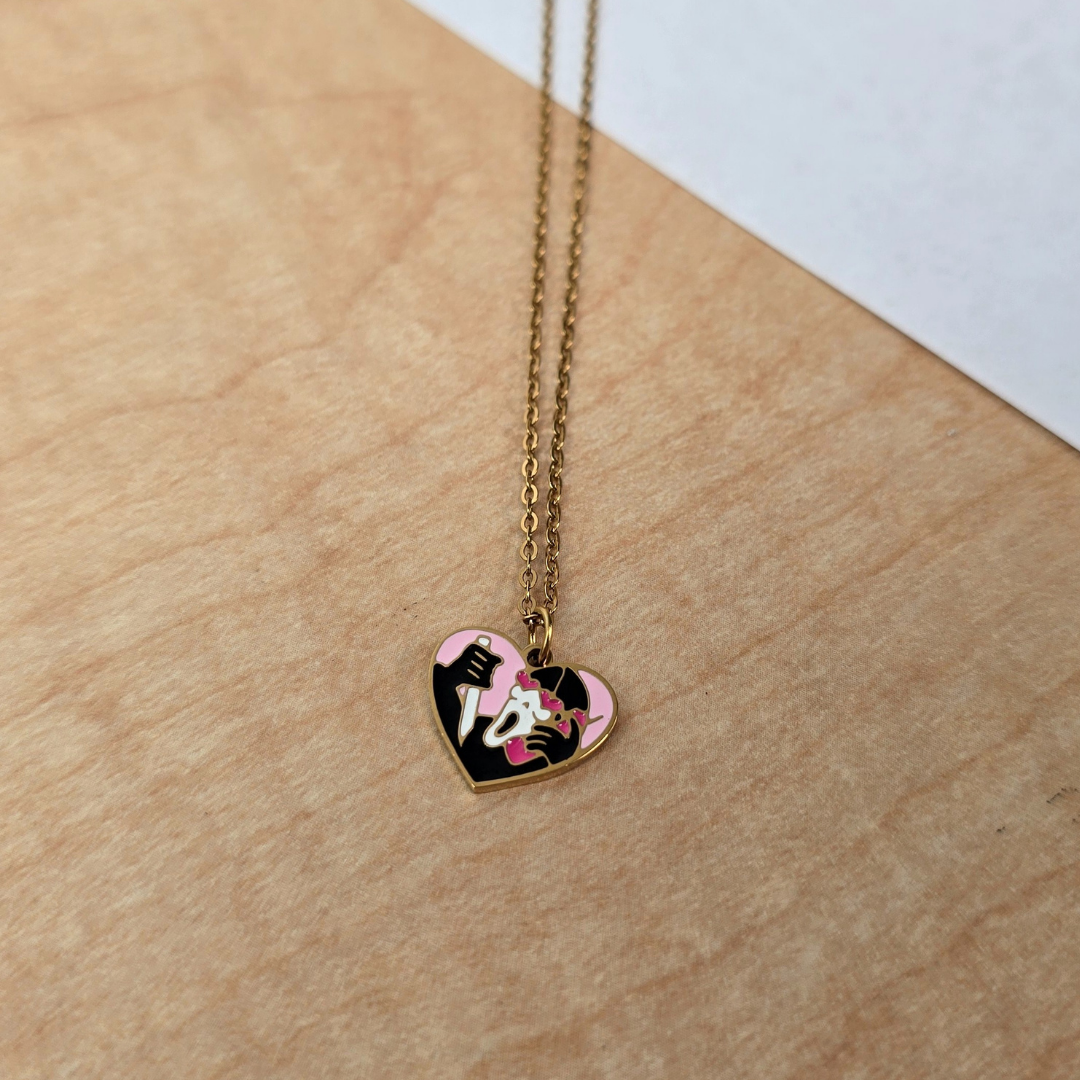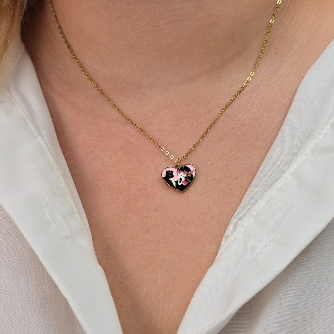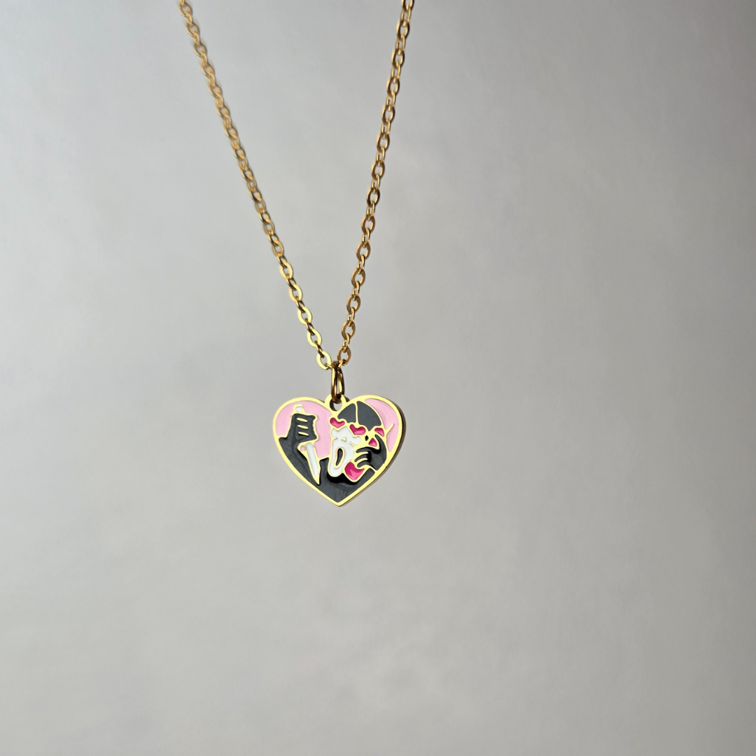 Descripción: Collar con romántico diseño de corazón con gatos enamorados en rosa y negro con detalles dorados en cadena dorada, fabricado en acero inoxidable. La cadena de acero inoxidable asegura durabilidad y estilo moderno, mientras que el corazón esmaltado con dos gatos besándose le da un toque de ternura única y amor por los felinos. Ideal para amantes de gatos, regalos románticos, San Valentín o expresar amor por los animales, este collar es la elección perfecta para un estilo romántico y adorable con personalidad gatuna.