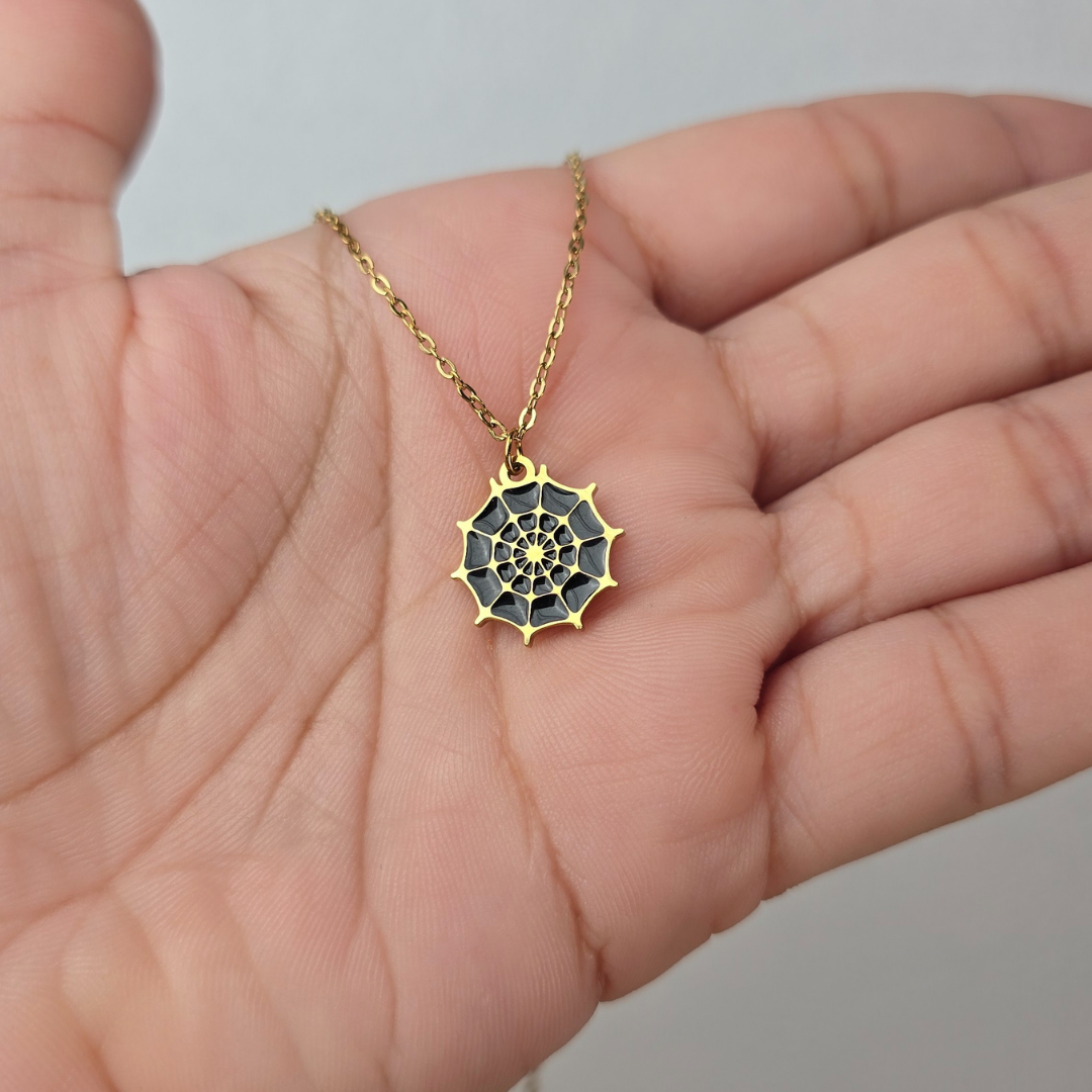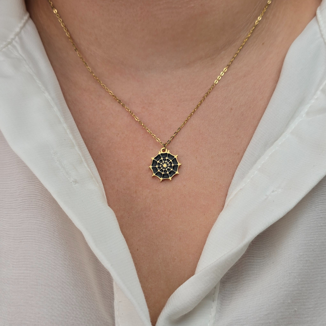 Descripción: Collar con intrigante diseño de telaraña esmaltada negra con marco dorado en cadena delicada dorada, fabricado en acero inoxidable. La cadena de acero inoxidable asegura durabilidad y estilo moderno, mientras que la telaraña esmaltada le da un toque de misterio único y estilo gótico elegante. Ideal para amantes del estilo gótico, Halloween, looks alternativos o expresar personalidad única, este collar es la elección perfecta para un estilo dark sofisticado y contemporáneo.