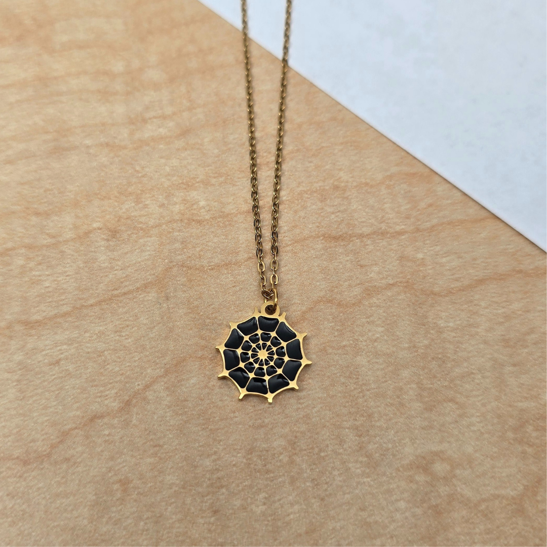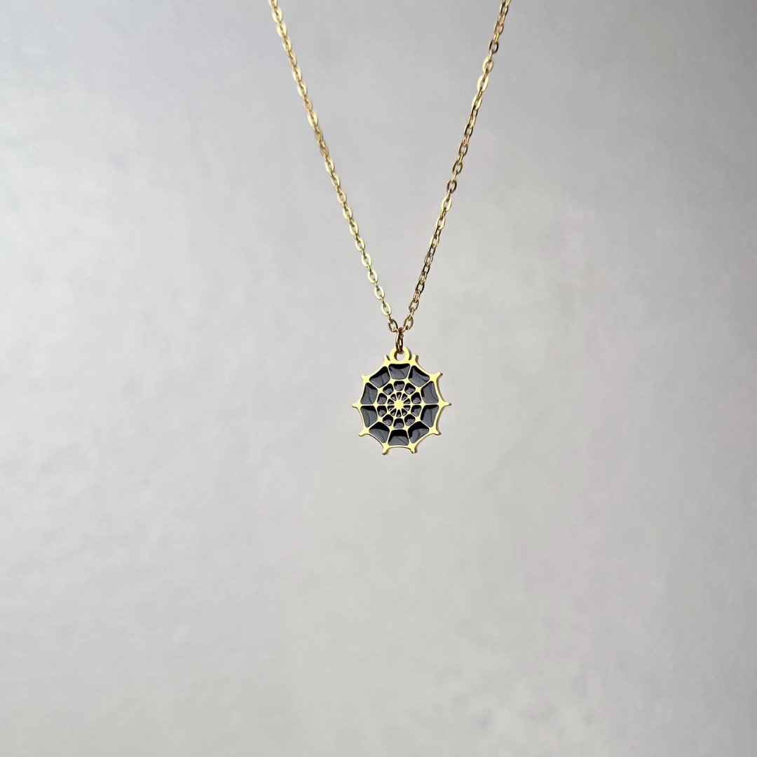 Este collar de acero inoxidable presenta un diseño gótico encantador con una telaraña esmaltada en negro mate con detalles geométricos y marco dorado que crea contraste sofisticado. Su diseño minimalista lo hace perfecto para uso diario sin ser excesivamente llamativo, mientras mantiene ese toque dark y misterioso. Su acabado dorado pulido garantiza durabilidad y resistencia al desgaste, ideal para lucir un estilo alternativo sofisticado en cualquier ocasión. La telaraña simboliza creatividad, paciencia y conexión con lo místico, perfecta para quienes aprecian la estética gótica con elegancia contemporánea.