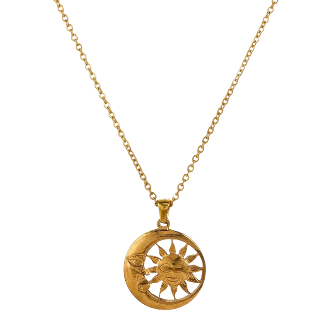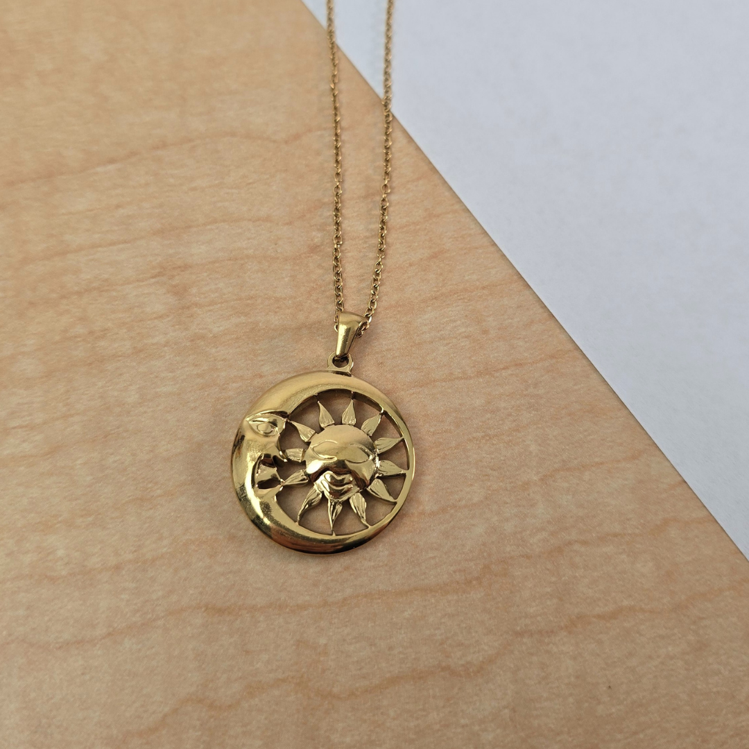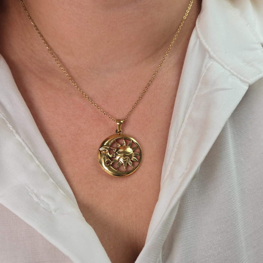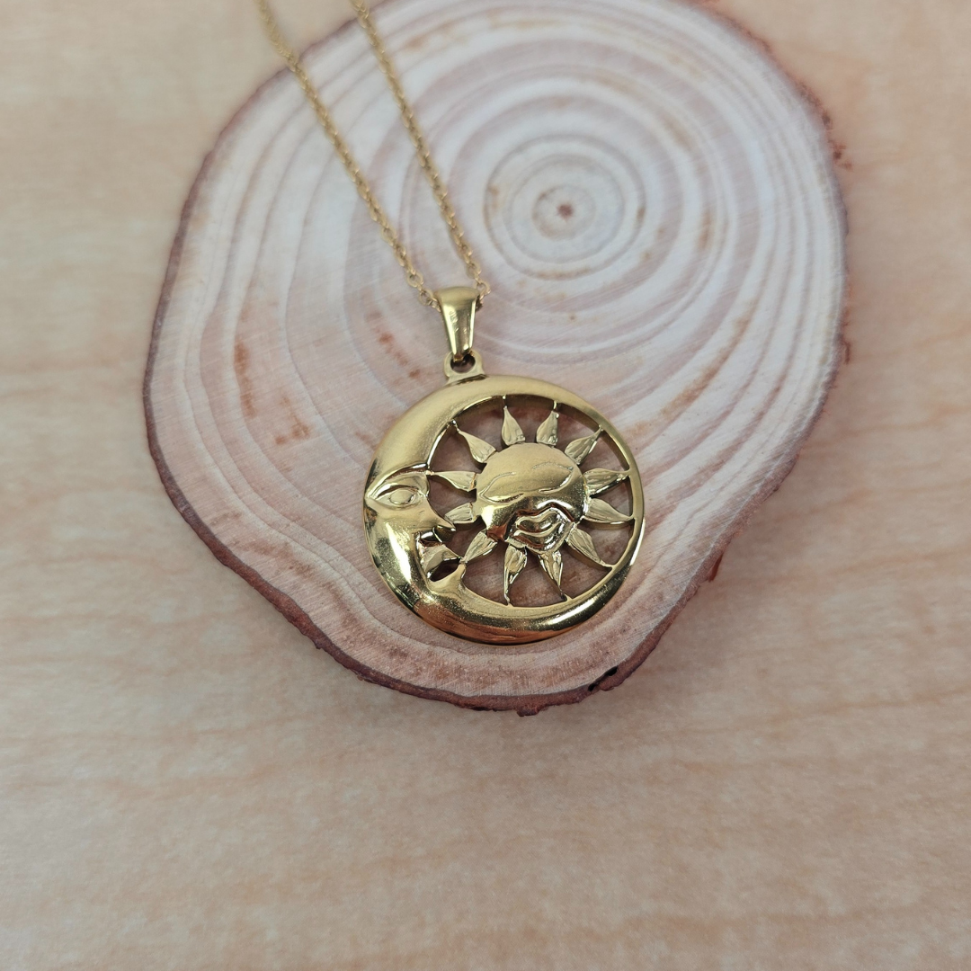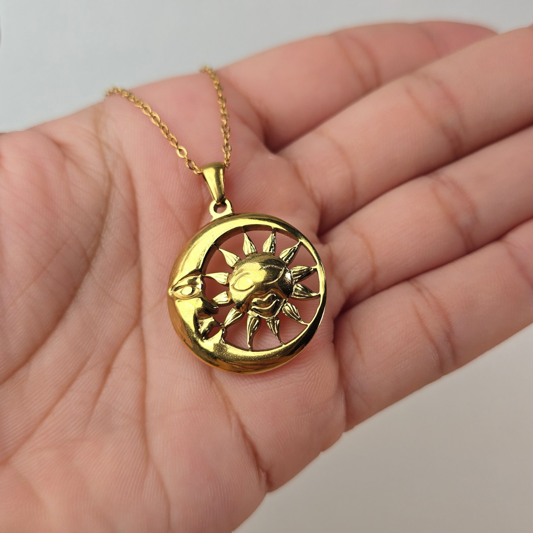 Este collar de acero inoxidable presenta un diseño bohemio elegante con un medallón circular calado que encierra sol y luna entrelazados. El sol tiene rostro sonriente con rayos texturizados mientras que la luna creciente abraza parcialmente al sol, creando balance visual perfecto. El diseño calado añade ligereza y delicadeza. Su acabado dorado pulido garantiza durabilidad y resistencia al desgaste, ideal para lucir un estilo espiritual con elegancia. El sol y la luna unidos en círculo infinito simbolizan balance perfecto, dualidad armoniosa, energía complementaria y ciclo eterno de día y noche, perfecto para quienes buscan joyería con profundo significado espiritual.