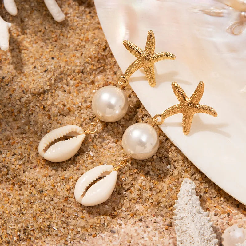 Descripción: Aretes con elegante diseño marino que combina estrella de mar texturizada, perla central y concha cowrie natural, fabricados en acero inoxidable. La cadena de acero inoxidable asegura durabilidad y estilo moderno, mientras que la combinación de elementos marinos auténticos le da un toque de elegancia única y sofisticación costera. Ideales para cualquier ocasión, estos aretes son la elección perfecta para un estilo tropical refinado.