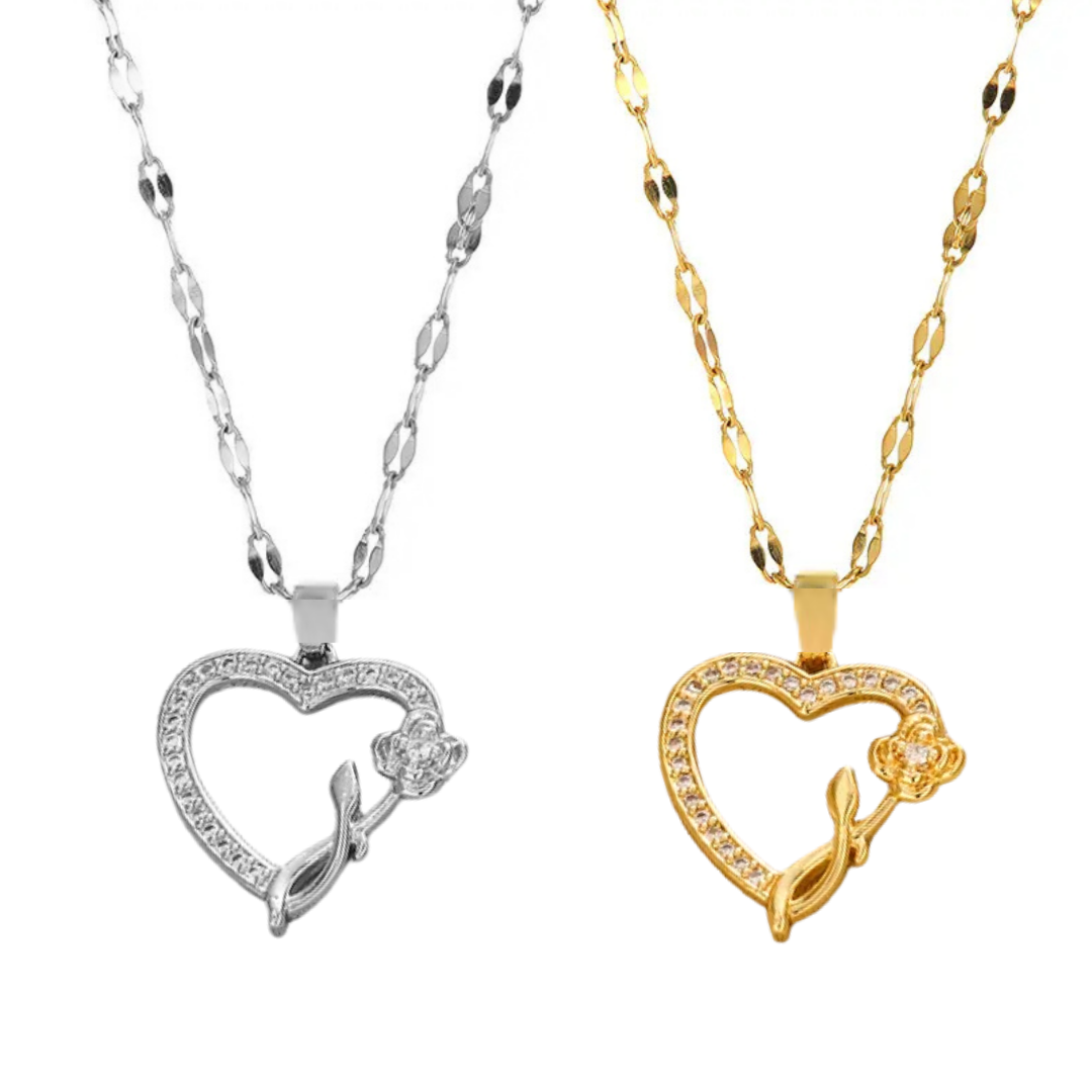 La cadena de acero inoxidable asegura durabilidad y estilo moderno, mientras el diseño de corazón con cristales brillantes y una delicada flor simboliza amor, conexión y elegancia. Ideal para cualquier ocasión, este collar es la elección perfecta para realzar tu estilo o regalar a alguien especial.