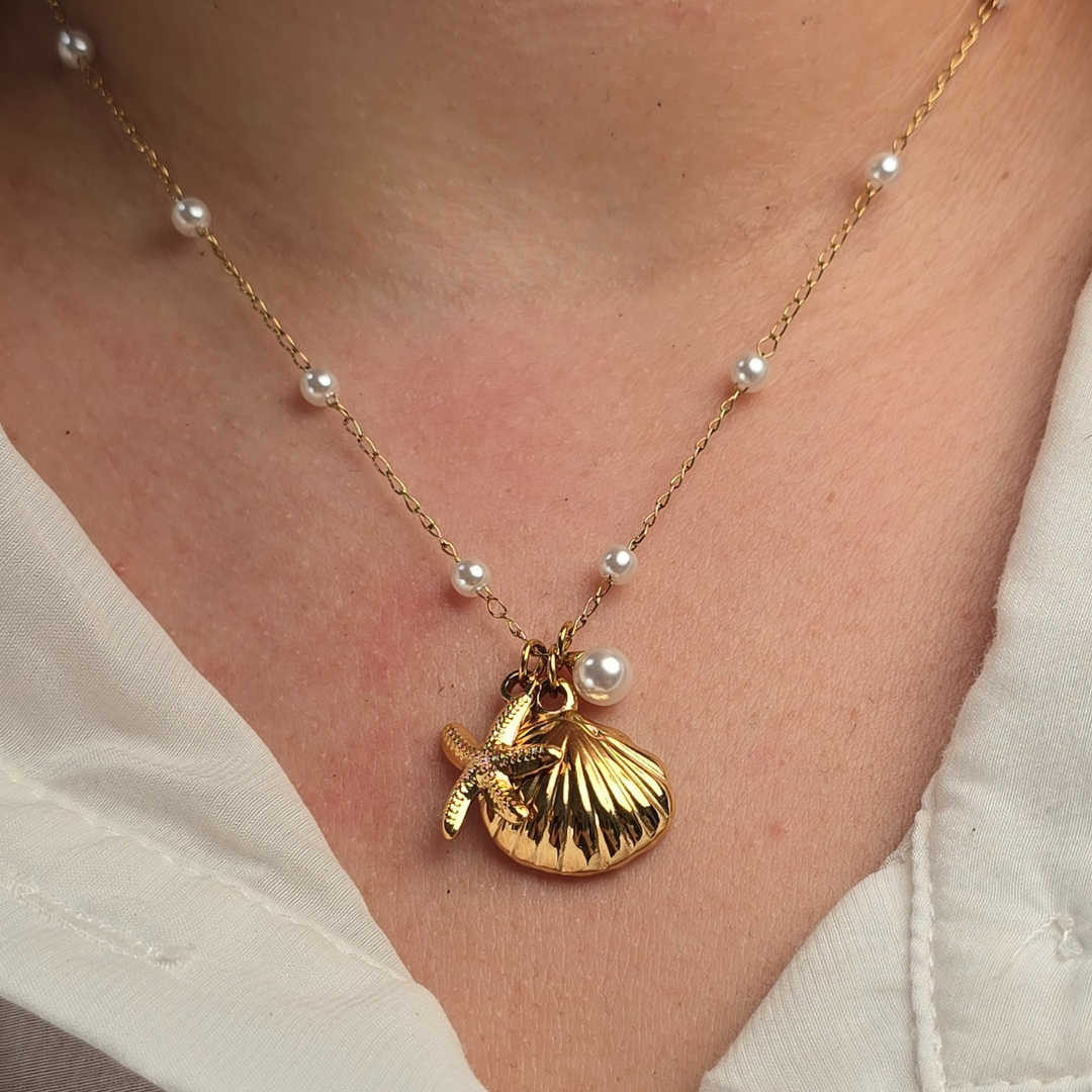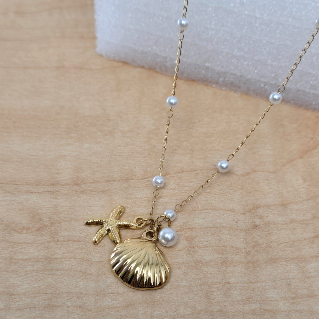 Descripción: Collar con una una estrella de mas, concha y perla blanca cadena en color Oro. La cadena de acero inoxidable asegura durabilidad y estilo moderno, mientras toque de mar le da un toque de elegancia única. Ideal para cualquier ocasión, este collar es la elección perfecta para tu estilo.