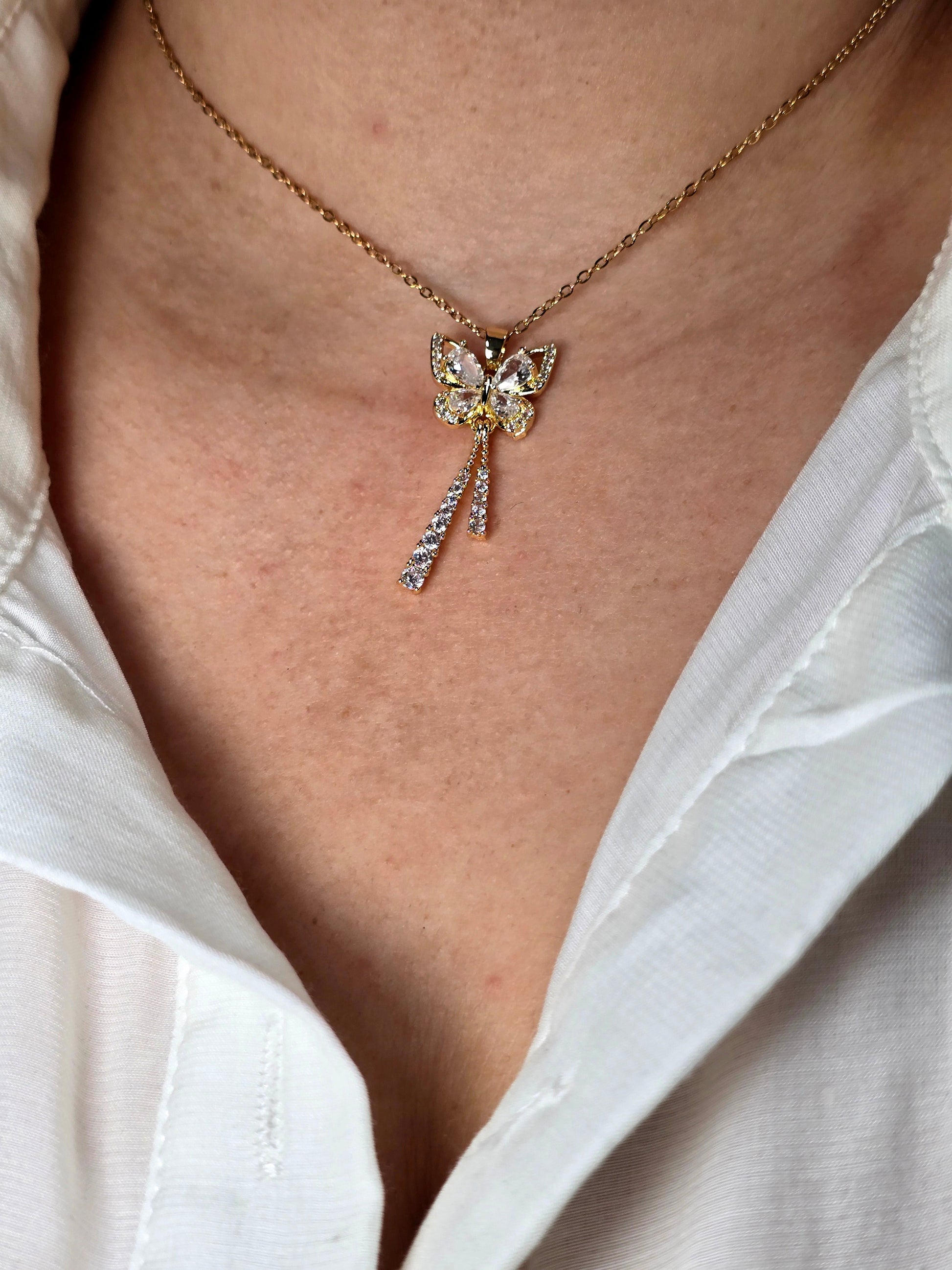 Descripción: Collar con mariposa. La cadena de acero inoxidable asegura durabilidad y estilo moderno, mientras la mariposa le da un toque de elegancia única. Ideal para cualquier ocasión, este collar es la elección perfecta para tu estilo.