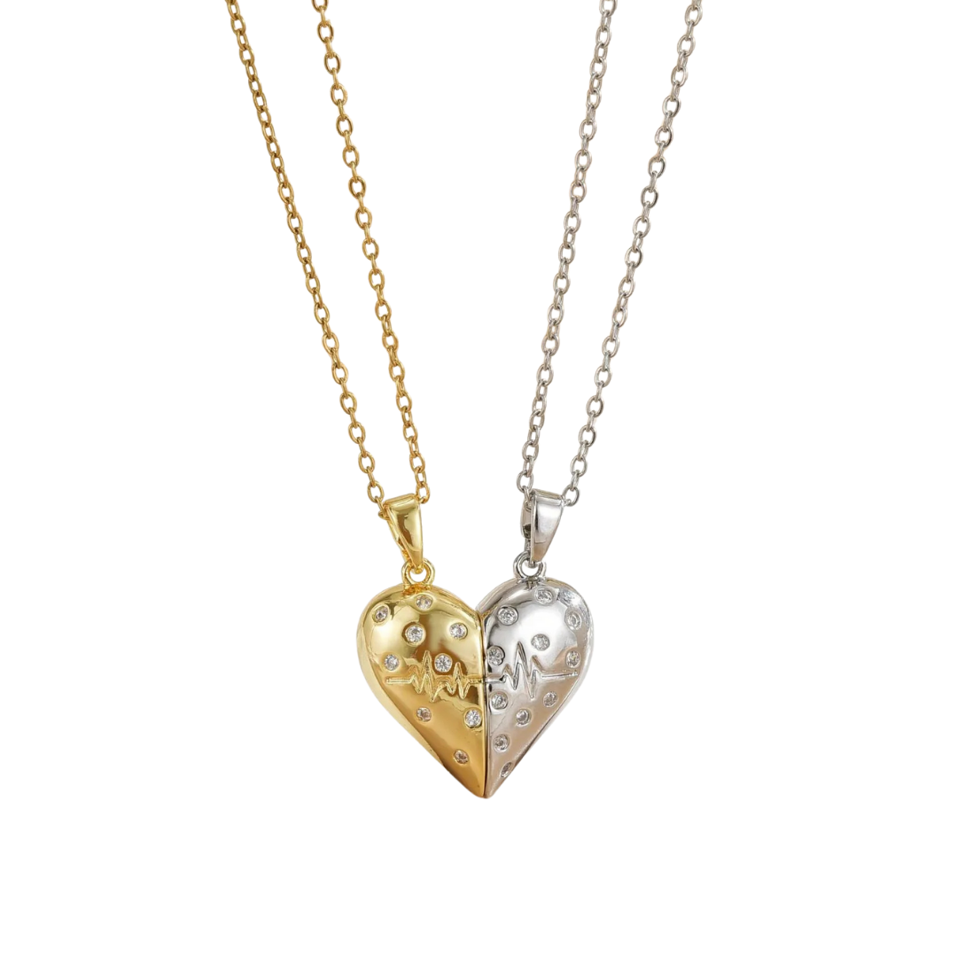 La cadena de acero inoxidable garantiza durabilidad y un brillo elegante, mientras el diseño de corazón dividido en dos tonos con cristales y un delicado latido grabado simboliza amor, conexión y unión. Ideal para cualquier ocasión, este collar es la elección perfecta para quienes aman llevar una joya con significado.
